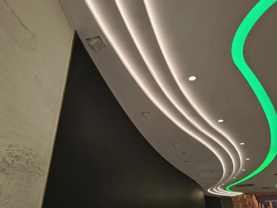 主展廳的聲學(xué)設(shè)計(jì)極具巧思,四組FBT VERTUS CLA604音柱揚(yáng)聲器像藝術(shù)裝置般懸垂于主屏幕兩側(cè),配合SUBline118S低頻系統(tǒng)的低頻延展,由AX3000功放驅(qū)動(dòng)出渾厚立體的環(huán)繞聲場(chǎng)。空間中分散配置的84只MARTIN Audio專業(yè)音響組件,包括A55點(diǎn)聲源揚(yáng)聲器、C6.8T定制化天花喇叭和SX118B低音,如同聲音的畫筆在不同區(qū)域勾勒出精準(zhǔn)的聲像定位。